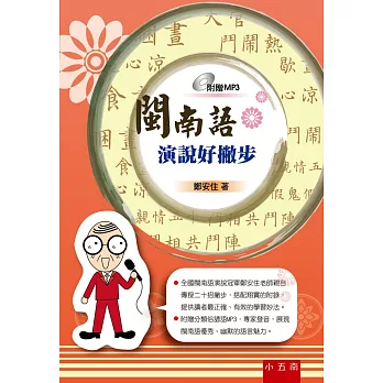 內容簡介: 博客來 本書針對閩南語演講時,須了解的數種技巧,包括:如何開場、如何引用切題且有趣的俗諺、如何抑揚頓挫、多音字的正確發音等等,以淺顯易懂、活潑有趣的寫法呈現;同時,為了協助讀者會講台語俗諺,除了書中附有分類翔實的台語俗諺,供參考外,亦由作者--曾榮獲全國閩南語演說冠軍的鄭安住老師,挑出容易學容易講的台語俗諺,親自錄音,以MP3呈現,方便讀者隨時學習。